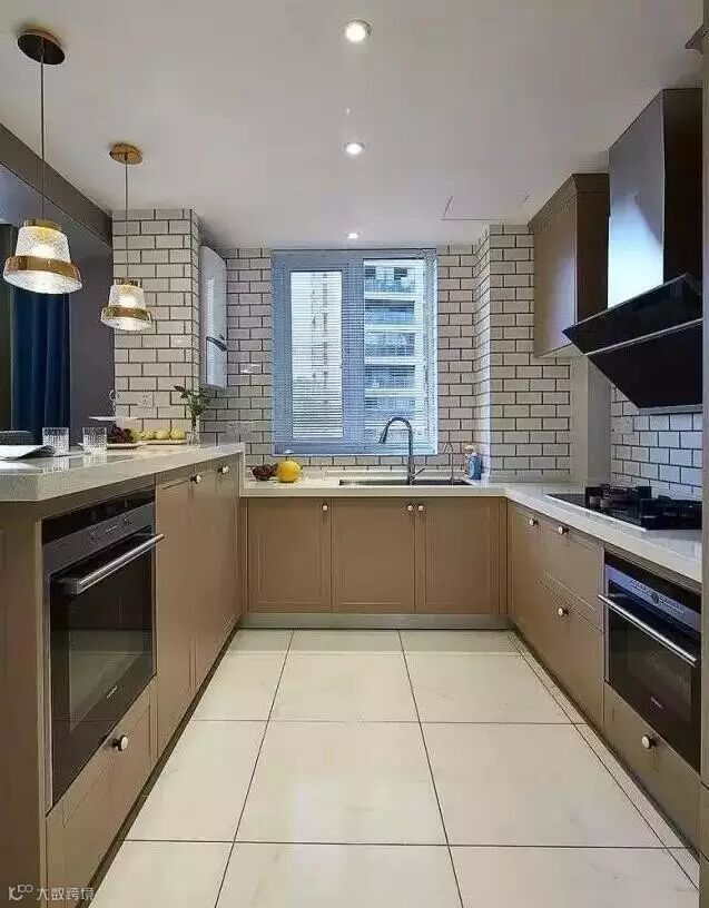 暖色系的U型橱柜,配着白色的石材台面,让厨房看起来温润而整洁