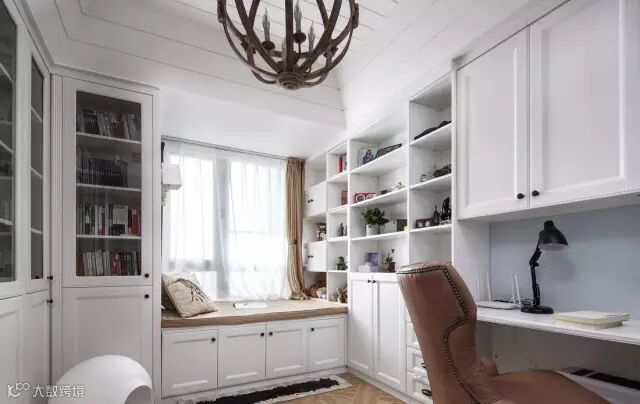 ▲书房的墙面空间充分利用,同时奇特的吊顶造型也使空间不显压抑局促。