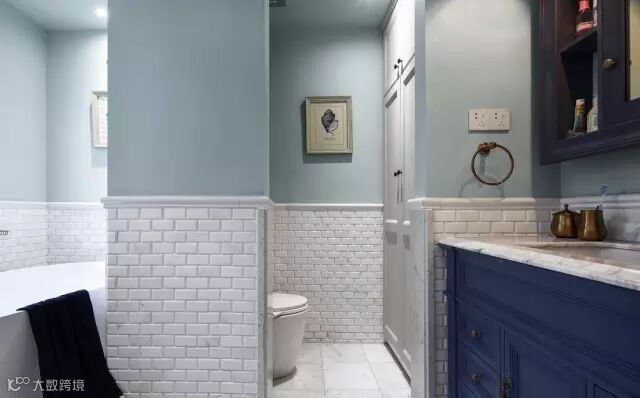 ▲有橱柜的卫生间,使用起来很方便,蓝色防水乳胶漆配合小白砖使得卫生间很有个性。