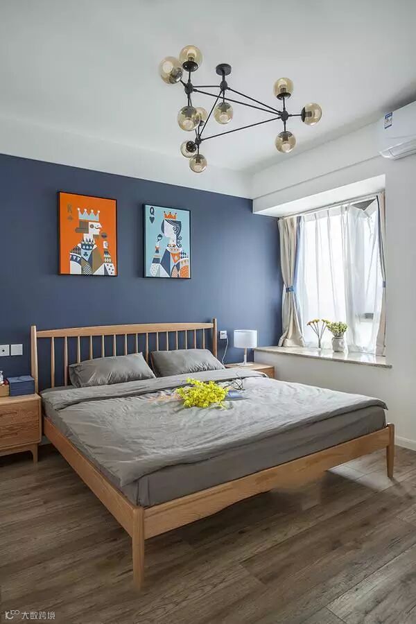 深蓝色背景墙深邃清爽,飘窗设计简约柔美给人舒服安宁的享受。
