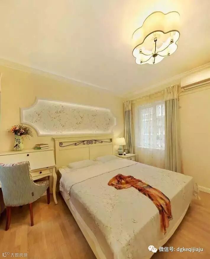 花形的主灯和床头的铁艺钩花互相呼应,