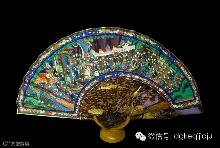一把18世纪的不对称扇子,藏于西班牙。玳瑁扇骨,丝绸扇面,上绘东方神秘国家——中国的生活。