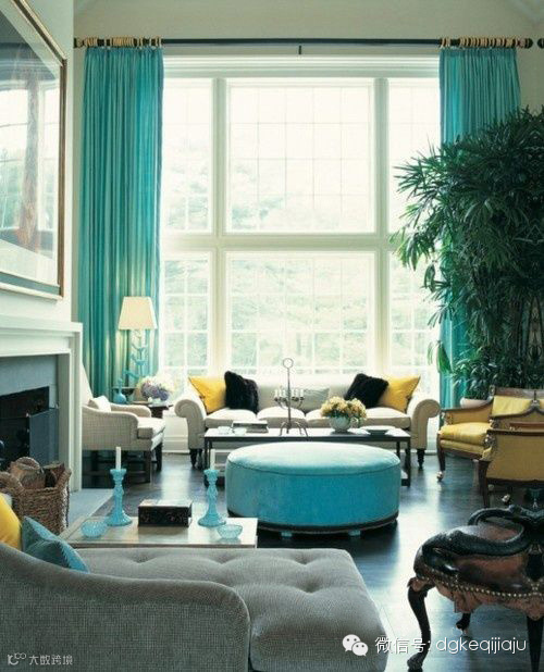 Tiffany Blue和灰色、黄色搭配,室内空间呈现宁静之感,悦动的黄色点缀能增添动感,营造浪漫氛围。灰色家具的使用是调和过渡色彩,起到缓和作用。
