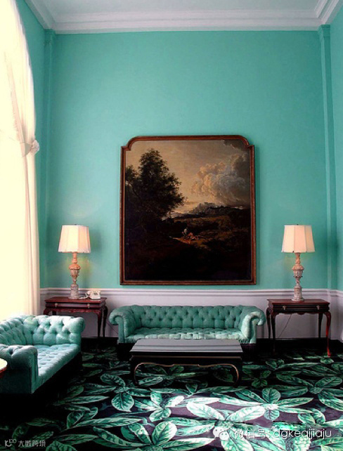 Tiffany Blue与棕色和深灰色搭配,有着别样的宁静沉稳之感,棕色家具的点缀能分散对Tiffany Blue的视觉注意力,而深灰色墙壁、地毯的装饰能为空间注入成熟之感。