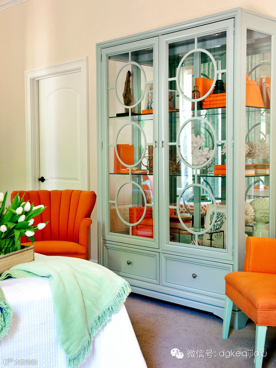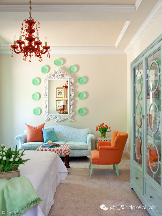 Tiffany Blue亮丽饱满,与热情的橙色搭配,浪漫之情溢于言表。加上杏色过渡,整个室内空间散发浓浓的夏日气息。无论是窗帘、沙发或者各式家具,融入Tiffany Blue,夺目耀眼。