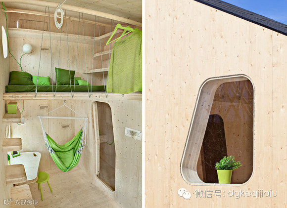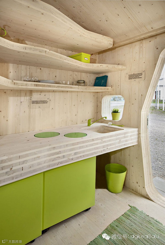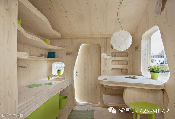 这座迷你公寓灵活运用每项设备,使其更有效率地拥有多功能用途,例如桌子同时是窗户遮阳挡板、墙壁置物架也是通往阁楼的楼梯。斜式屋顶能使太阳能板的效能提高,有厚度的木质墙壁、玻璃窗户则能让室内有保温效果,并且在视觉上看起来更宽敞。