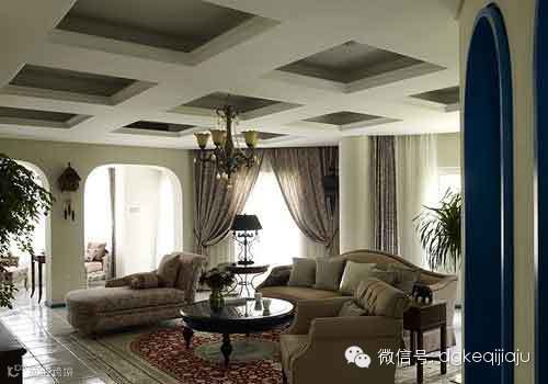 经过改造还是很宽敞的,特别订制的软装家具,彰显着优雅舒适的气质。与家具同色系的碎花窗帘,高贵浪漫,隐约间又带着些许的小清新,非常唯美动人。由于房子顶部有两根实梁,碍于美观,设计师将房顶特别做成了九宫格样式的吊顶,干净简洁的同时又不失大气。整个客厅的设计将地中海风格的美演绎到极致。