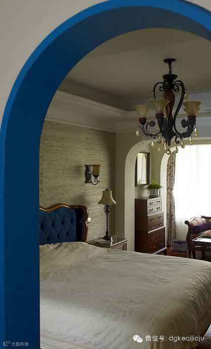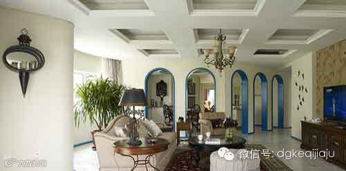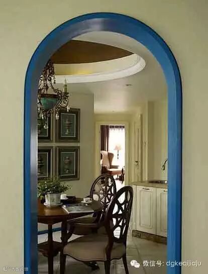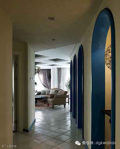 站到门厅处望向客厅,能看到客厅中的家具,但亮点并不是家具,而是连续的蓝色卷拱,王卫设计师通过六个蓝色卷拱,既营造了地中海设计氛围,又用门巧妙阻隔了餐厅与客厅,这样的设计有趣又实用,让人印象深刻。