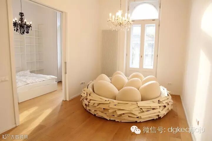 以色列Merav(Salush)埃坦和加斯顿Zahr OGE创意组的灵感来自鸟巢的结构,以这个为基础来开发这个大的、幽默的倾椅空间。被称为巨大的鸟巢来创建新的想法,圆形木制结构充满柔软,蛋形的枕头和旨在作为“融合的家具和操场。”
