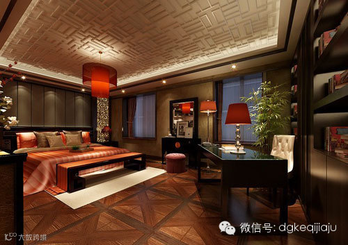 这个别墅卧室空间也是以米黄为主色调,红棕色地板为辅色,而鲜艳的红色是点缀色彩。陈伟设计师似乎对红色情有独钟,而他对红色的运用每一次都能恰恰点到好处,都能起到点睛之笔的作用。很多设计师害怕用红色,而陈伟则把红色运用得游刃有余,收放自如。