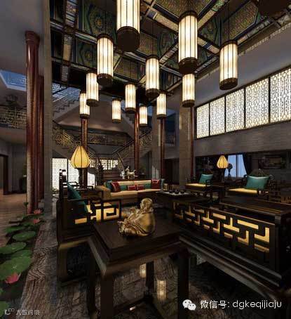 黄色沙发垫和绿色靠枕都是十分艳的颜色,与空间的咖啡色形成一种明显的撞色关系。旁边水池里绿色的荷叶和粉红的荷花也于无声中融入了画布中,为这幅原本就国色天香的画更增添了出神入胜的一笔。