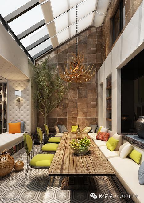 挑高的空间气势恢弘,与粗狂的木质桌子有机结合,冷金属流苏吊灯从房顶垂直泻下,拉伸了整个的空间感,再与墙壁拼接图案相趣成章,给人以庄重豪气之感。独一无二造型独特的地毯表达出简约的内在,使得整个空间富有低调气质又不失味道。它们不仅造型华美,还增添了温婉的气氛。各种颜色的可爱靠垫又是这里不可或缺的精彩演出,融合又跳跃充满趣味。