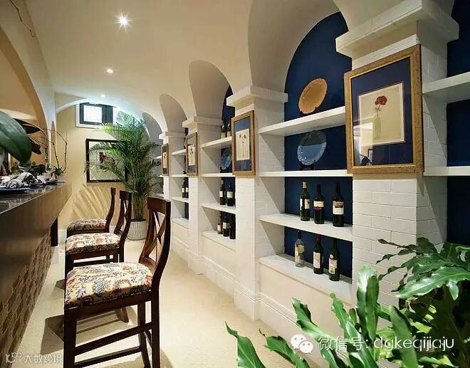 【休闲区装修图片】白色的建筑构架与蓝色的墙衬形成很浓的地中海特点,印花的实木高脚凳朴实中略带几分精致的美感,角落葱茏的绿植赋予空间蓬勃的生命力。