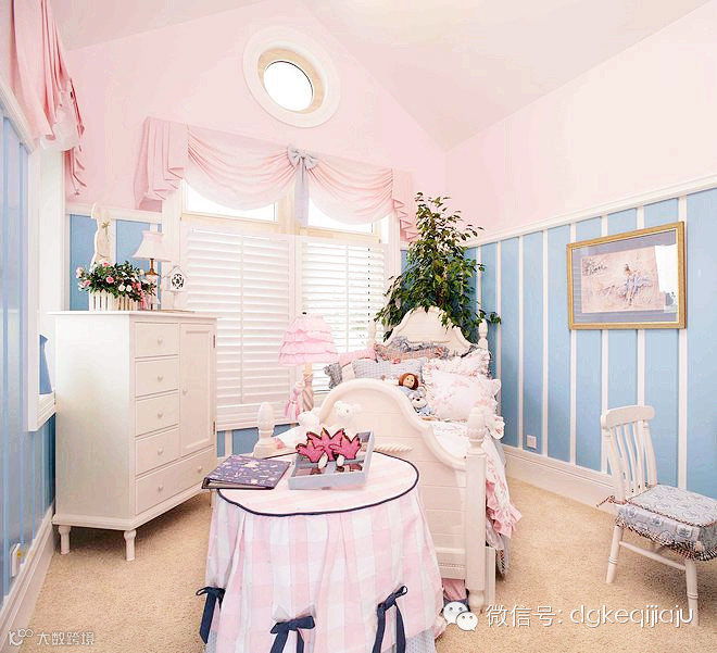 【儿童房装修图片】以粉色为主题的房间可爱而不失甜美,与蓝色宽条纹的墙纸搭配起来,有趣而不单调。不规则的婴儿床摆放更方便主人对于婴儿的照料,裙摆的台灯和茶几极具公主气质。