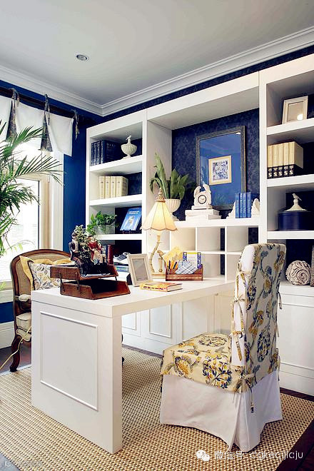 【书房装修图片】白色的书架和书桌形成统一的空间构架,与蓝色墙体一起打造出时尚而浪漫的地中海风情。印花的靠椅和小格子纹路的地毯缓和了白色对视觉带来的强大冲击。