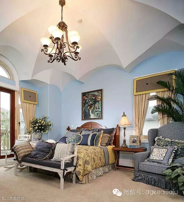 【卧室装修图片】颇具异域风情的吊顶极具浪漫梦幻色彩,复古的铁艺吊灯刚毅而不失柔美的韵味。造型简单的实木边几做工精良而富有怀旧的色彩,墙上动漫的油画增强了居室艺术的魅力。
