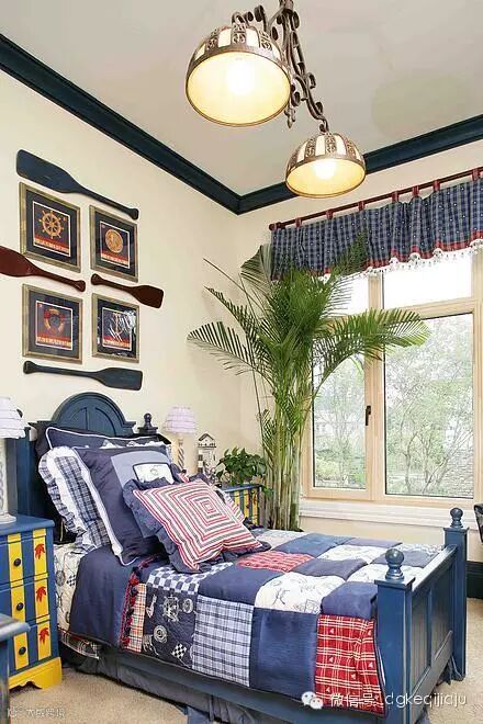 【儿童房装修图片】床头背景墙上精心悬挂的壁饰融入了航海的元素,意在渴望男孩能拥有不断探险的勇气。蓝调的床品与复古的吊灯搭配起来,相得益彰,以凸显男子的阳刚之气。