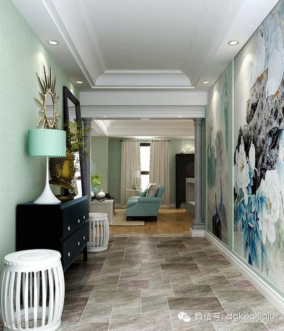 【走廊】原始石料肌理与薄荷绿墙面形成很好的搭配,还原了空间美式的质朴与自然,并为色调浓郁的墙面做到很好的衬托效果。家具陈列从样式到颜色都追求着一种简约的格调,这样在走廊凉面墙之间形成对比,一动一静的场景设置让这个附属空间变得更有艺术价值。