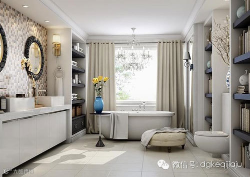 【盥洗室】做艺人要时刻注重保养自己的身体,因此在盥洗室的设计上,则着重从康体和保健两个方面出发,设置了SPA浴缸,并从台湾订购一台蒸汽机为日常保养所用。同时在盥洗室内还设置了大型化妆台,为个人保养提供了必要的设备和空间。
