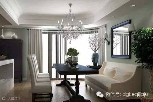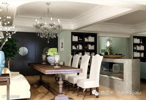 【餐厅】餐厅整体呼应客厅的色调,深棕色餐桌、书柜加深了餐厅的沉稳感。在复古水晶灯的衬托下,带有些许古典高靠背椅、木桌还原了现代西式家庭的生活方式——在优雅中绽放高贵的气质,这正是隐藏在东方气质下的轻古典情怀。
