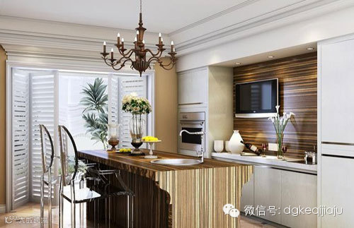 【西厨】根据业主要求,我在西厨设置了岛台。西厨使用了大量木质材料,与铜制吊灯搭配出和谐的效果。这个空间有方便使用的家电和储藏柜,方便业主储藏和拿取。此外,在这里还配备了一个小型酒柜,可储藏七八支红洒。这样可以方便,业主平时和朋友一起吃一些简餐和便当,同时也便于开办一些小型聚会使用。