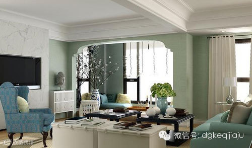 【从客厅望向阳台】飘窗的设计在增加客厅功能性的同时,又带出少许美式设计的自由感。花枝与带有东方色彩的陶瓷花瓶在清淡薄荷绿的衬托下,散发着一种朴实的圣洁感。花枝早已盛开,赋予空间鲜活的生命力。