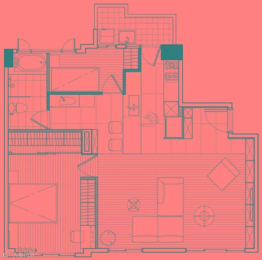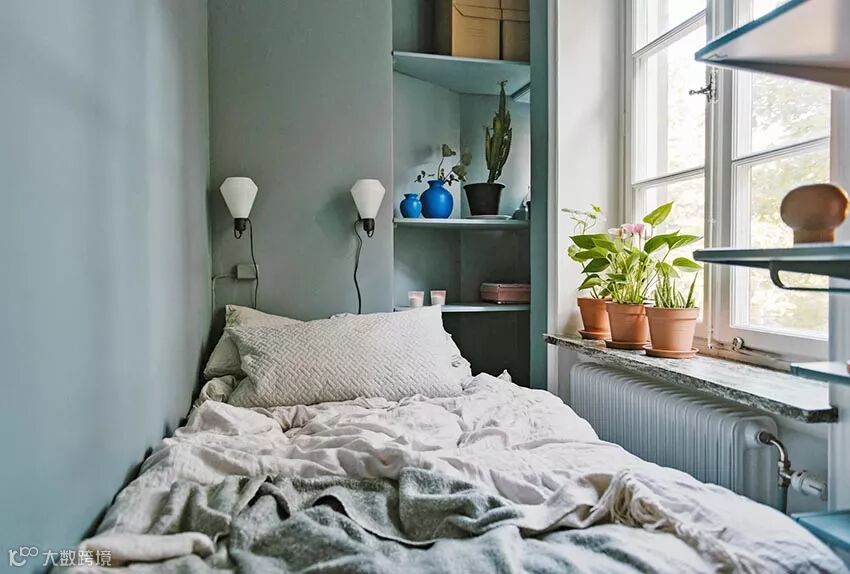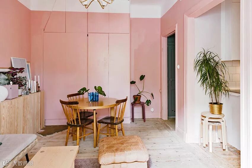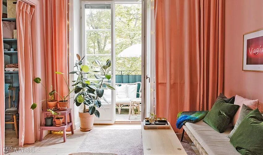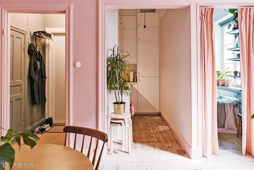 来自瑞典的粉红girl给房间刷上鲑鱼粉,赋予房间一种粉红魔力,让不足30㎡的空间内处处都显得轻盈又柔和。女性的包容特性也在此空间有所体现。这位粉红girl的小心机还有用布帘代替门片一项,既节省家装费用,又为空间增加了轻盈调性。而我也注意到,她特别挑选了垂坠感比较好的质地的布帘,这样轻盈之外,空间质感也得到提升。