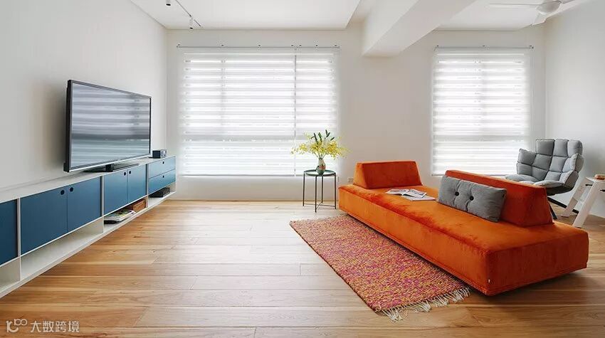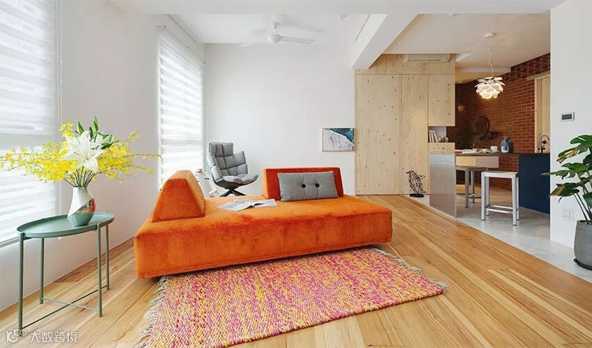 设计师提出用家具而非墙壁来做空间定位的概念。引入的家具均可根据需求的变换而移动。如此一来,客厅不仅仅是客厅,还可以变身活动室,让喜爱瑜伽的酷girl 随时活动起来。蓝色电视柜,大橘色沙发,灰色单椅,这位girl的品味真的很棒。