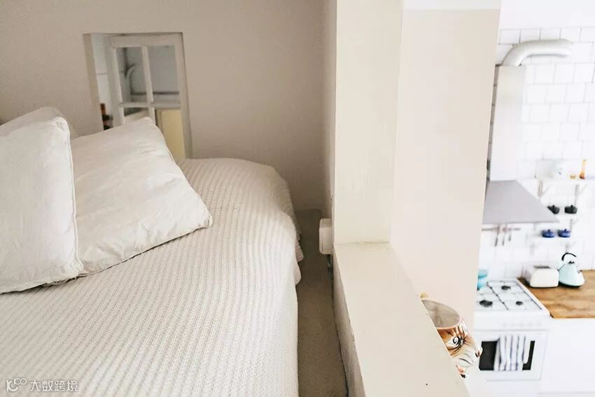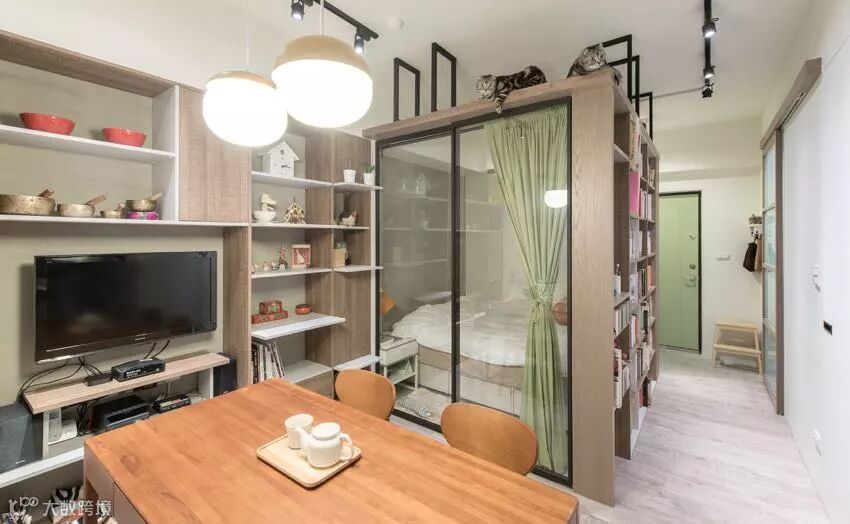 即使是在这么小的空间内,仍然用玻璃墙和窗帘打造出封闭型卧室,在满足安全感的同时,引入光照,让小宅温馨明亮。