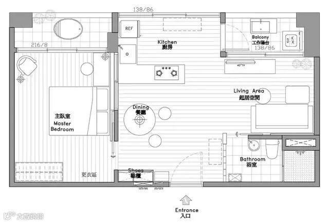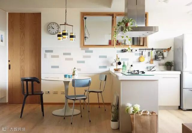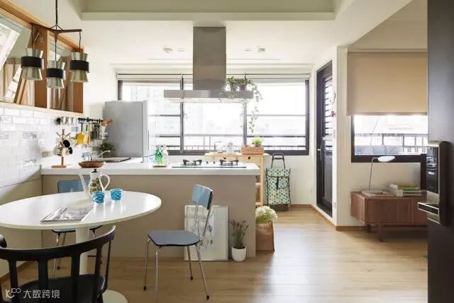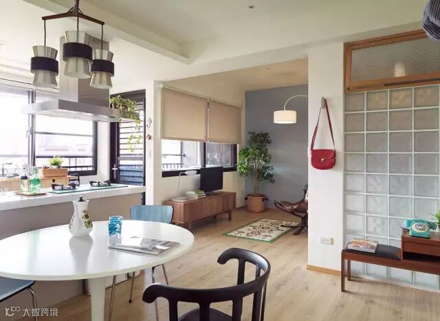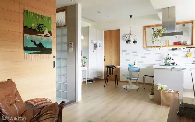 ▼开放式空间,串联客厅、餐厅、厨房,对墙采光蔓延至玄关。进门不会因为空间小而压抑,反而因为整体开放区域而心情舒畅。