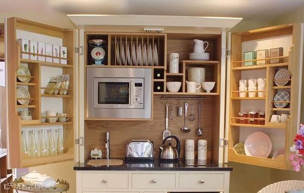 隐藏状态中的小厨房,则是一个美式乡村风格的优雅立柜。