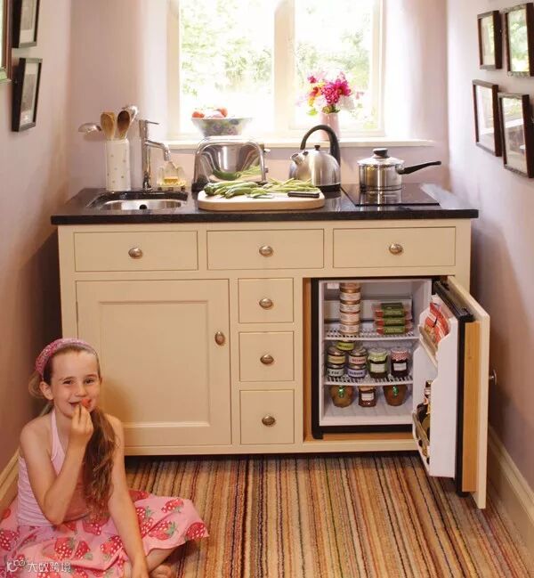 小厨房还可以移动哦,不需要的时候把它移到角落,不占地方;需要做饭的时候则将其移到通风口,有效避免油烟哦。