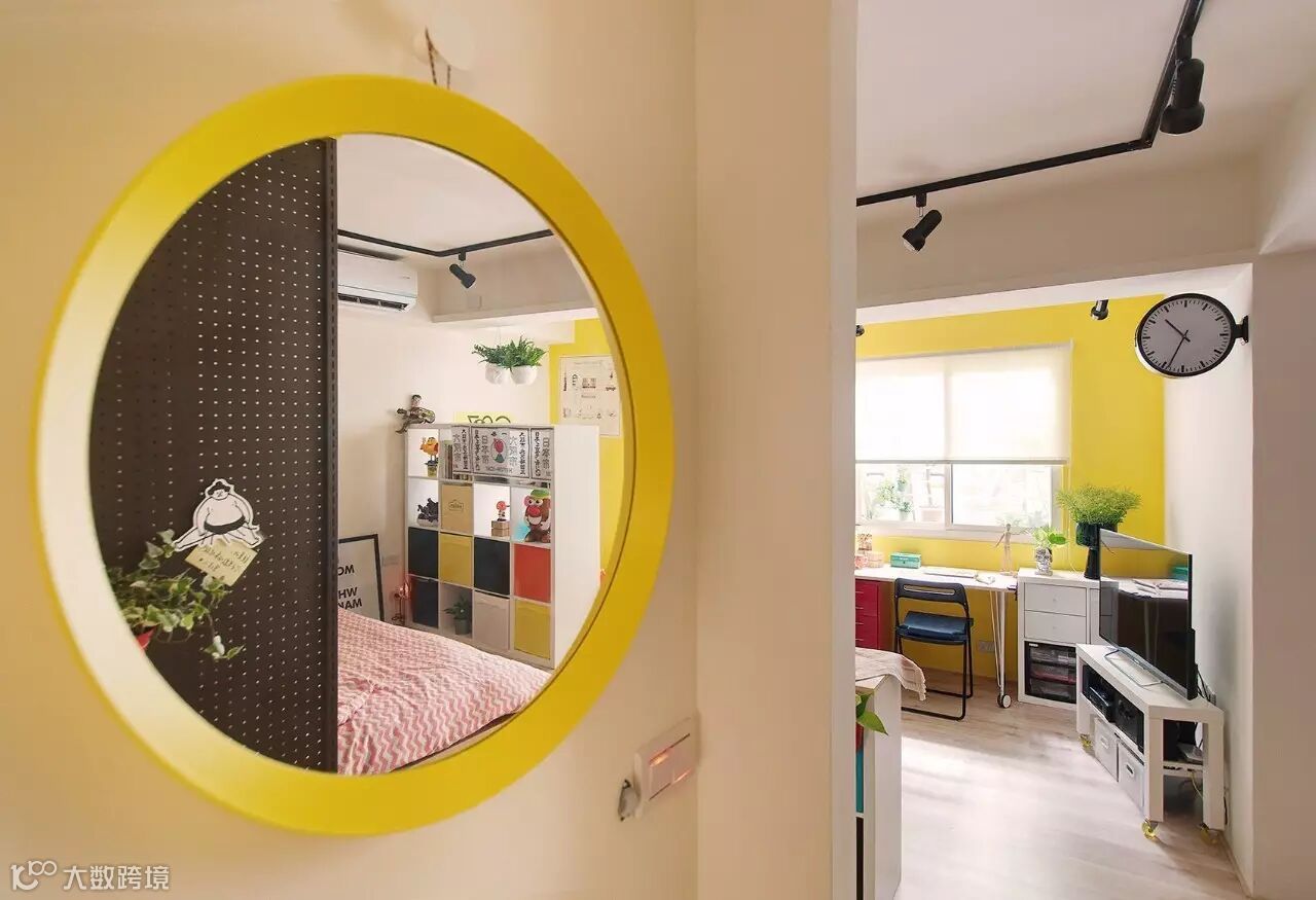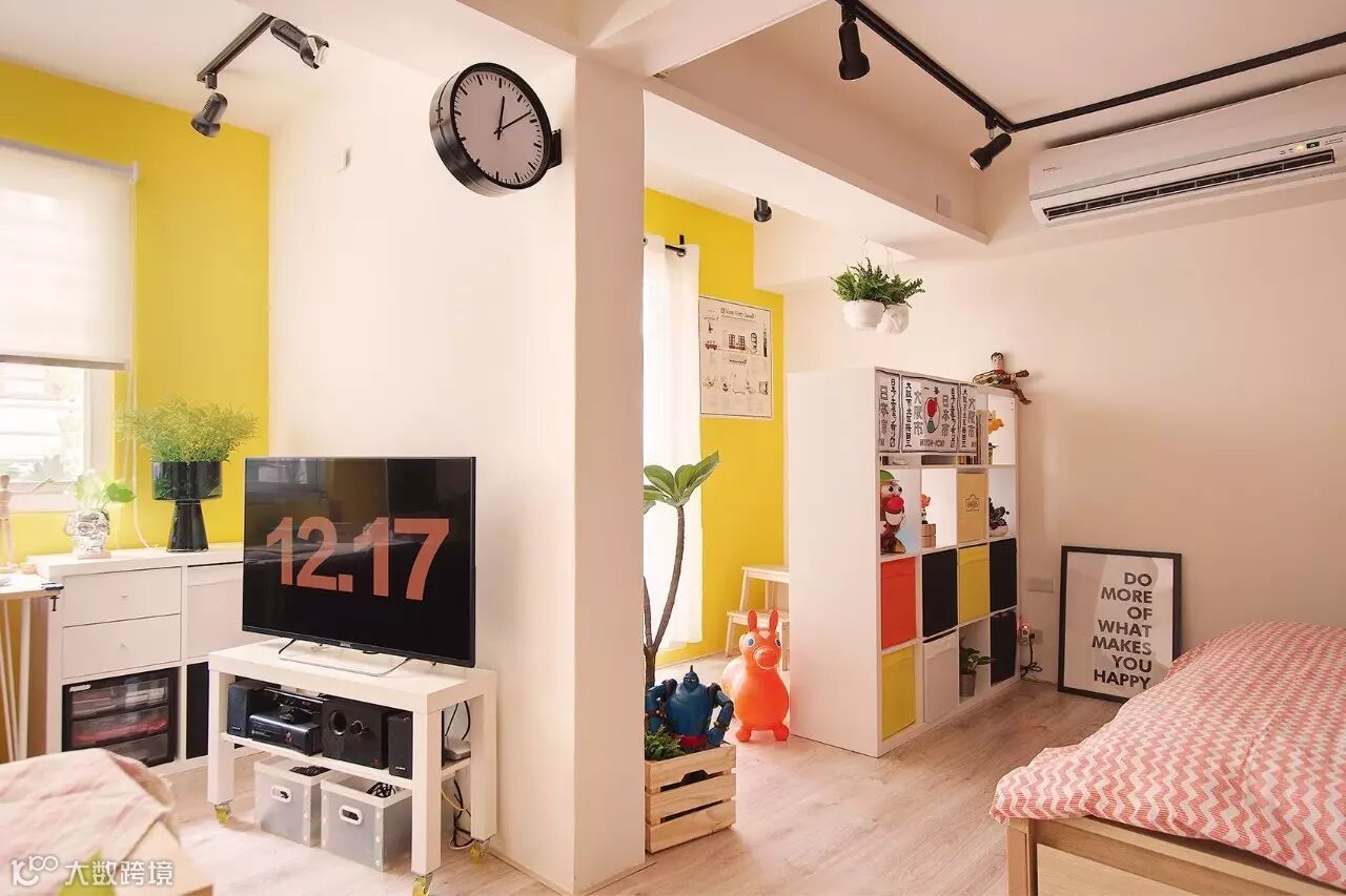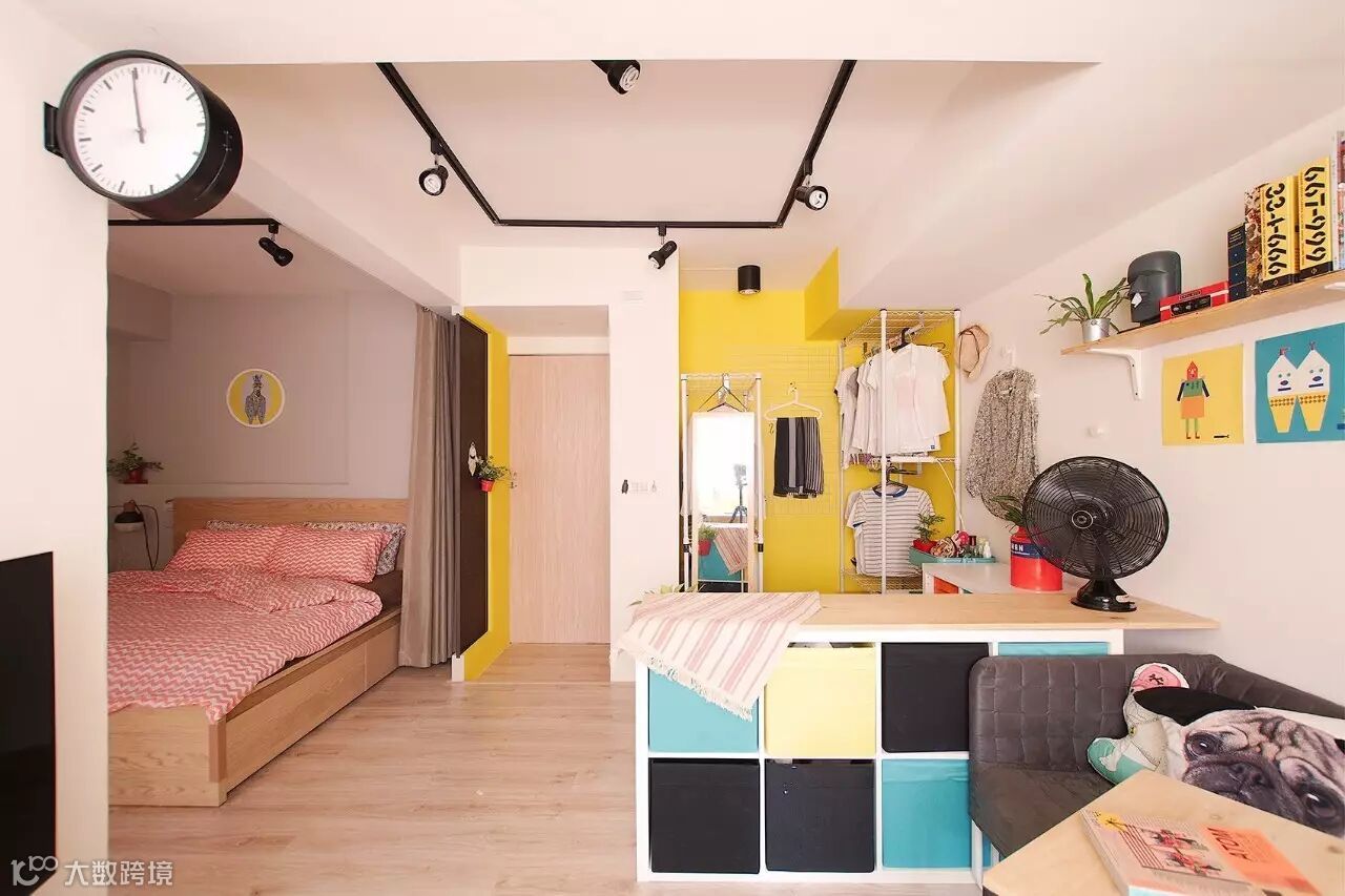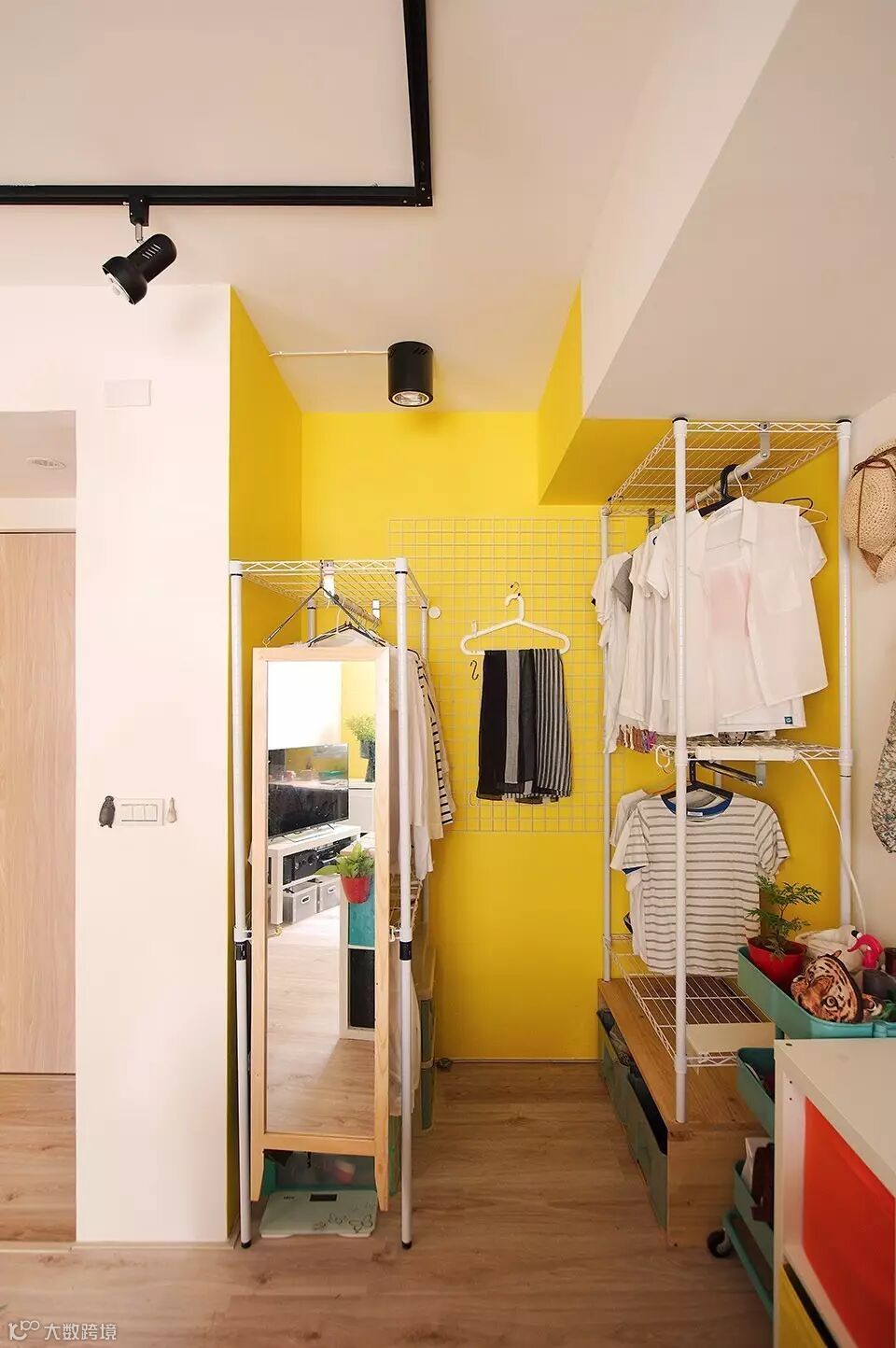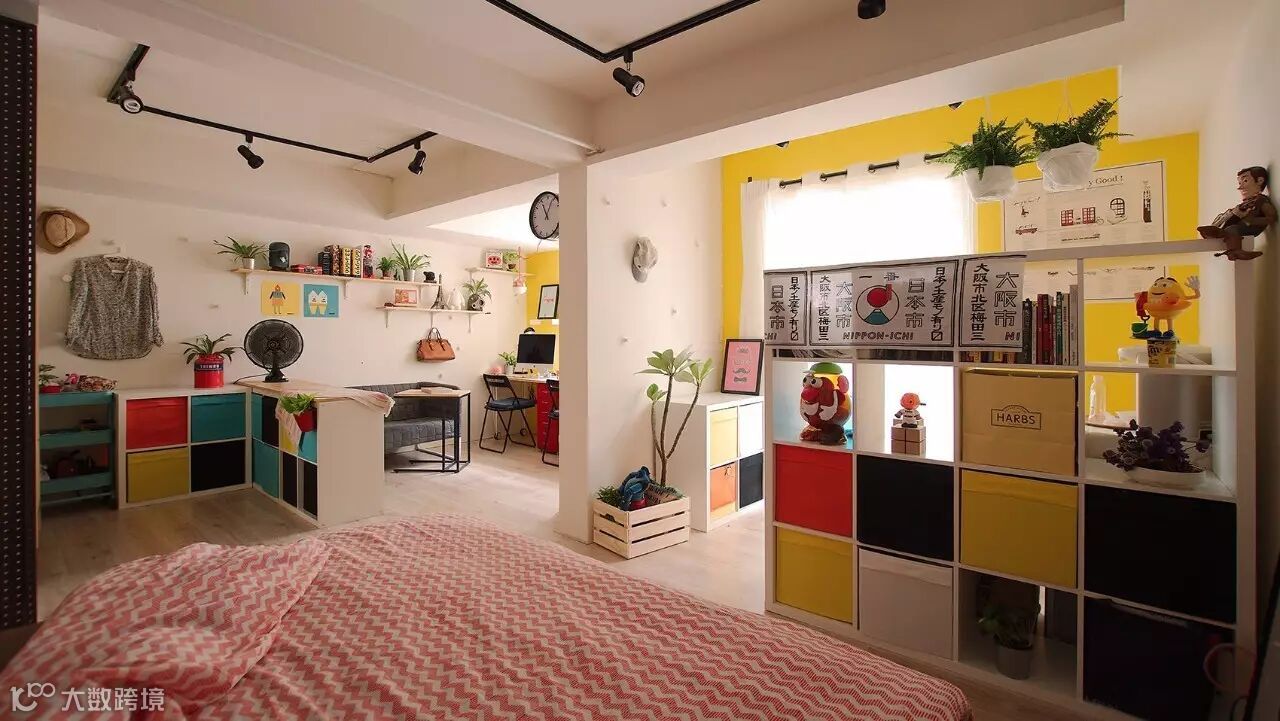 ▼卧室到活动室之间,衣帽间到客餐厅之间使用了开放式收纳柜,配合高彩度收纳框,让整个家在绚丽多彩的同时,拥有充足收纳空间。