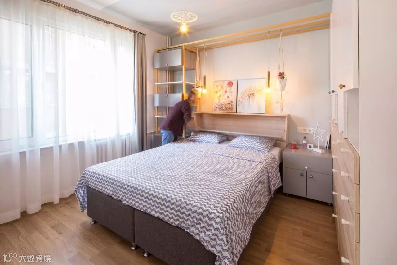 ►►到顶衣柜和床头置物架联合定制,创造一个高自由度的空间。