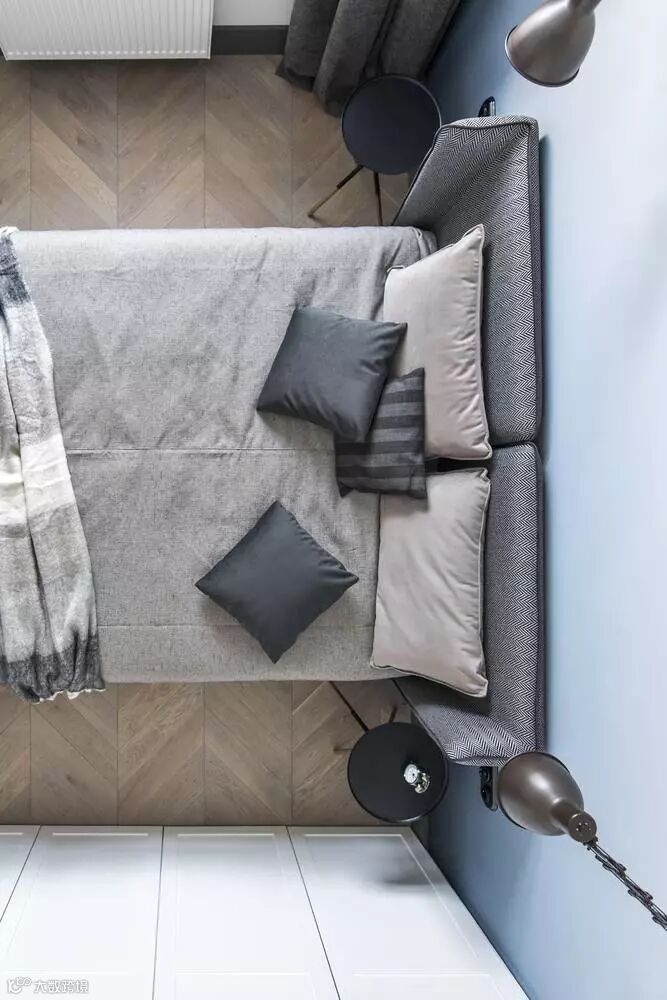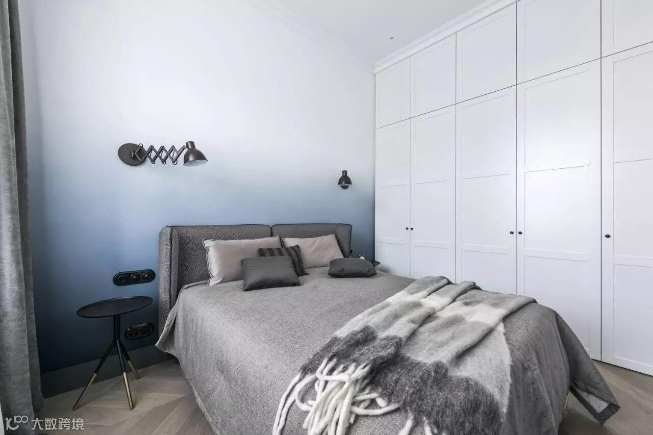 ►►最惊艳的是,床头这面墙设计了一个天空从亮到暗上下循环的渐变阴影效果,与窗外光线变换遥遥对应。渐变蓝为本来只有黑白灰的简单空间增加了复杂感,也增添更多艺术气息。