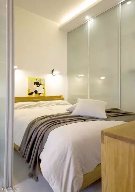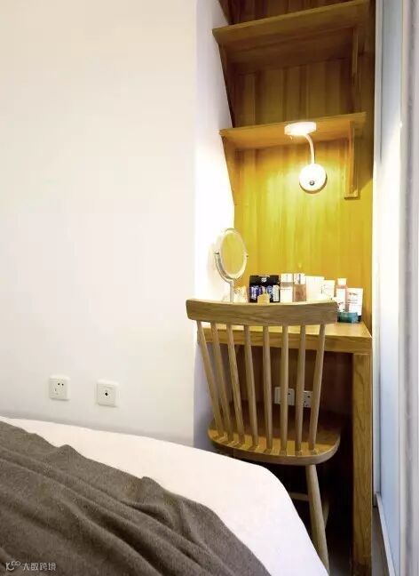►►滑门做分隔是为了尽量减少小空间的封闭压抑之感。尽管空间如此之小,设计师将空间功能发掘到极致,巧妙地为小卧室设计了可同时作为工作台使用的梳妆台。