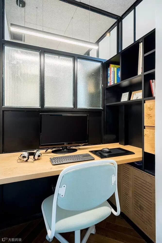 ►►电视柜分隔出客厅和工作间,封闭工作间内是一分为二的两个工作台面,电视柜背后也能进行收纳。