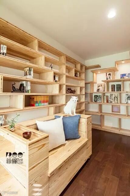 3、 书柜、置物柜等明格柜采用定制型加宽隔板,在看似不可能的地方增开猫道。