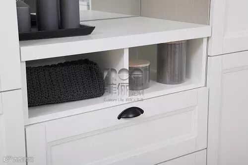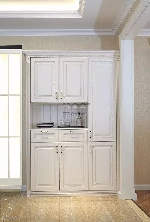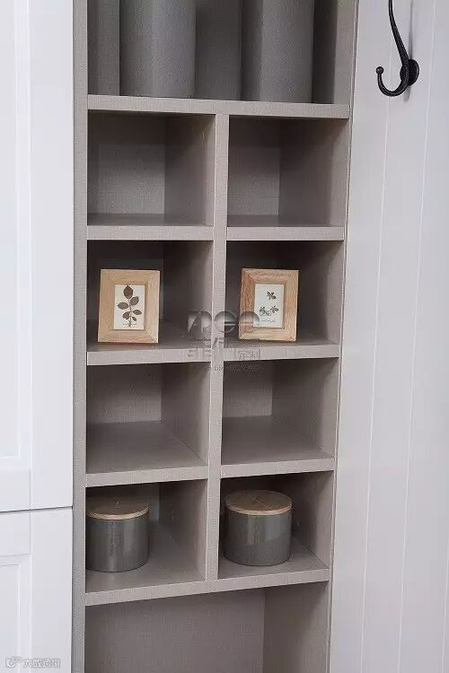 ►到顶完全收纳柜,其内有多规格收纳柜的设置,收纳能力最强,但装饰性不足,一整块的视觉效果也稍显压抑。