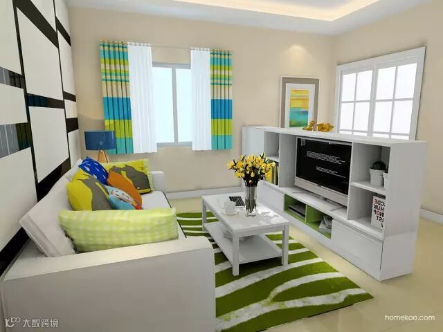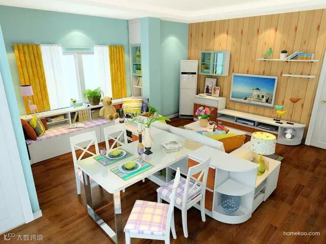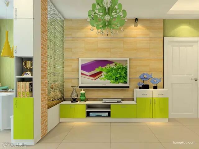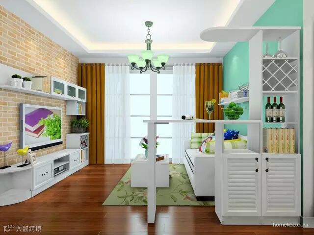 隔断柜还能作为电视墙,电视的旁边放置客厅杂物,每天晚上一家人围坐在这温馨的小空间里看连续剧看节目。