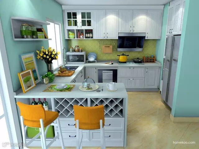 开放式厨房中使用隔断柜,作为厨房与外部功能区的分割线,让空间界限层次分明,还能作为餐桌就餐,下面的也可以放置一些厨具碗筷等。