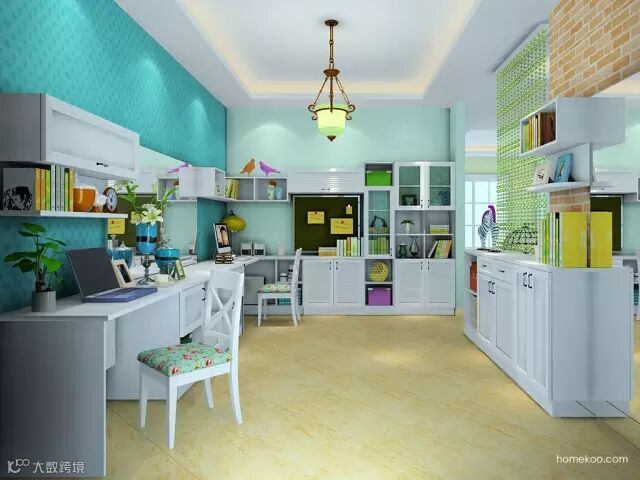 客厅+工作间,如果在家办公时间少,又不想单独设置书房,就可以利用隔断柜和帘子隔出这样一个小小的工作角落,看书办公都不成问题。