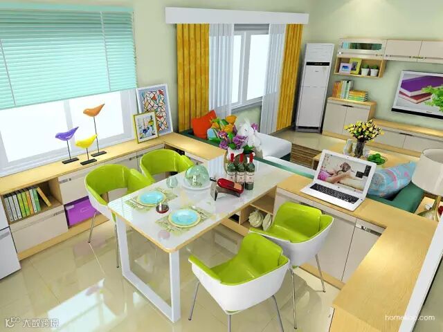 隔断+飘窗,通过两面的隔断柜和飘窗结合起来围成用餐区和休闲区,四周都能放置收物品,身在其中还有一种被包围保护的安全感。
