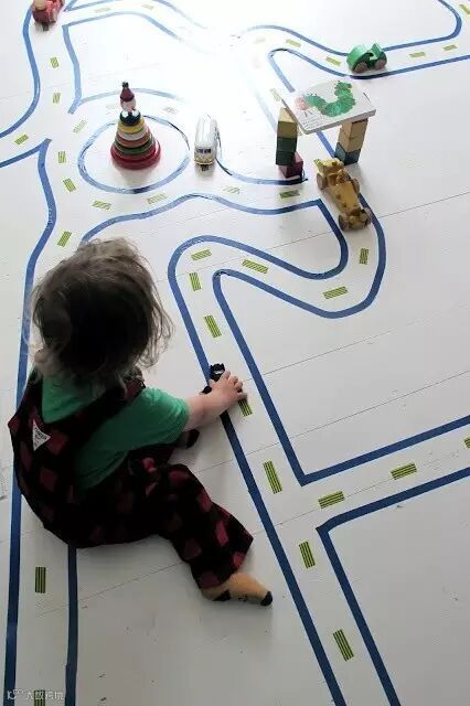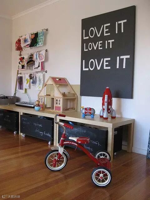 ▲ 黑板墙衣柜门+挂衣杆+地面玩具跑道。