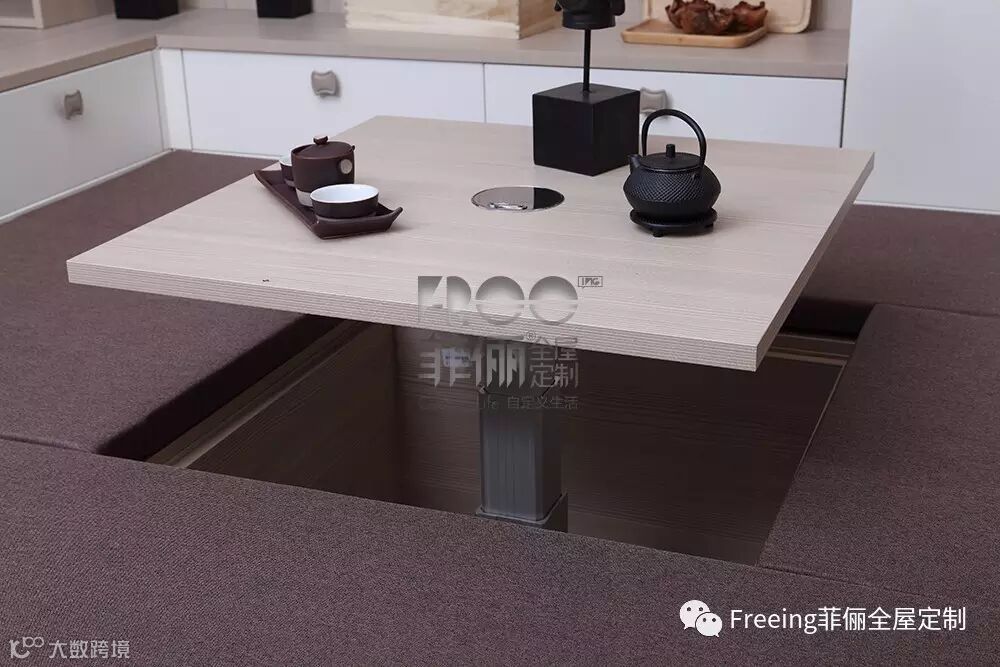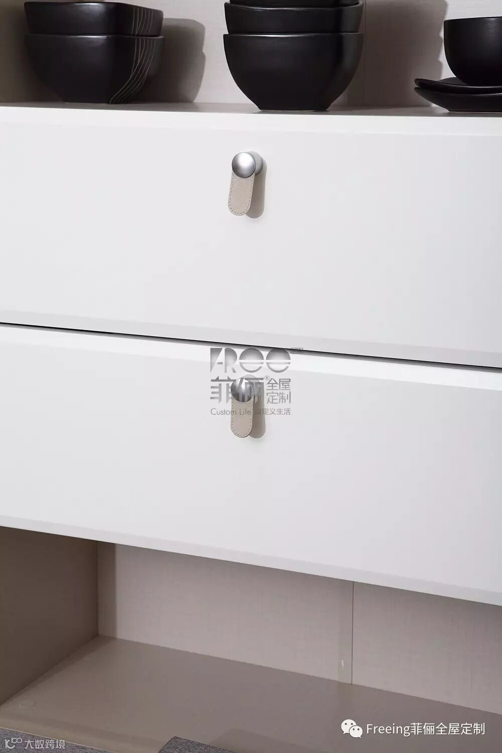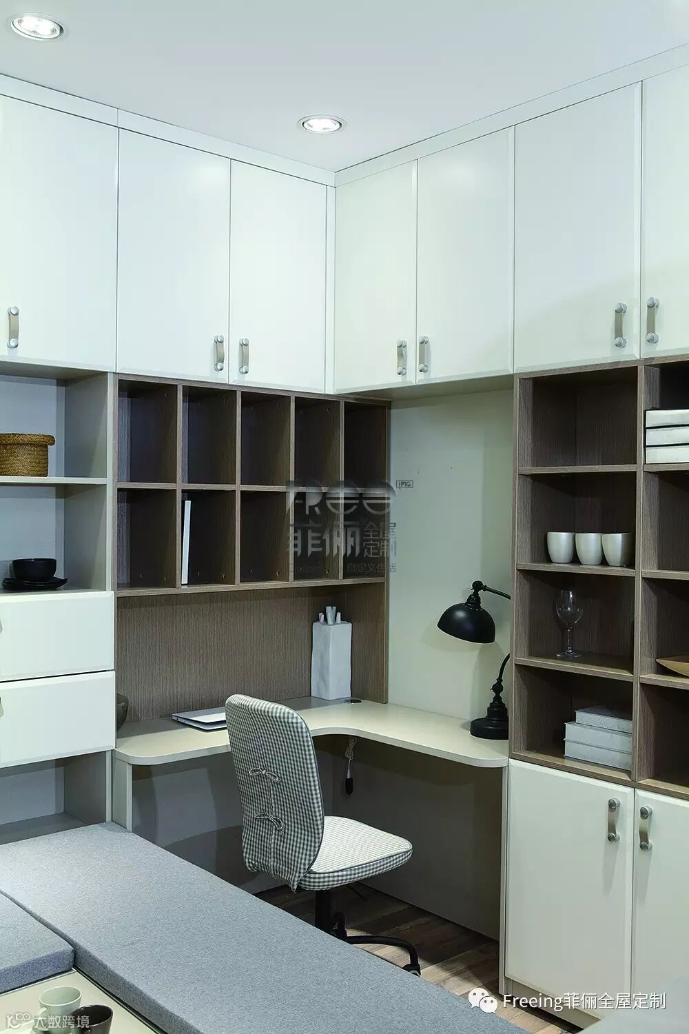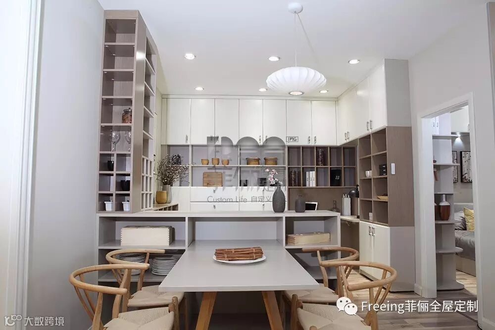 客餐厅书房一体的榻榻米设计。色彩上最新引进奶白皮纹和迷雾灰两种门板,混搭多尺寸明格柜,营造出一种时尚休闲、自在沉静的空间氛围。