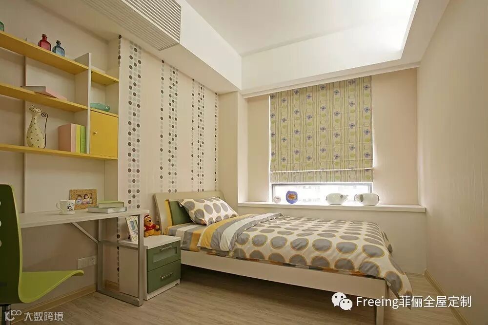 用色彩造梦。很明亮的黄、很清新的绿,是和公共空间截然不同的色调,让孩子在这个色彩天地中尽情畅游。简易的明格柜和书桌都显得不那么精致,是因为孩子的创意不需要用太多标准来设限,就让他感觉轻轻松松,又敞敞亮亮。