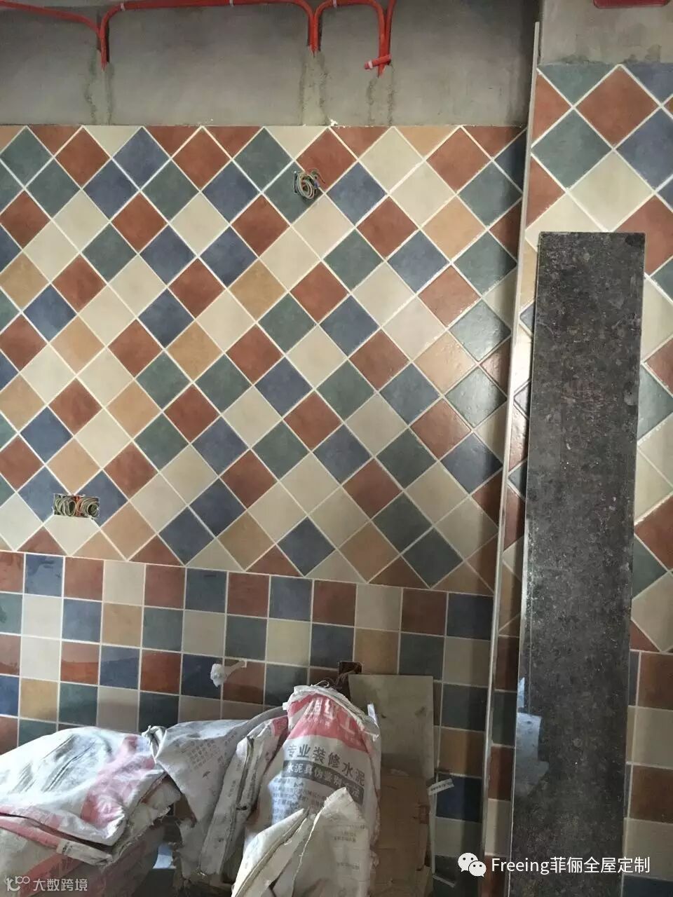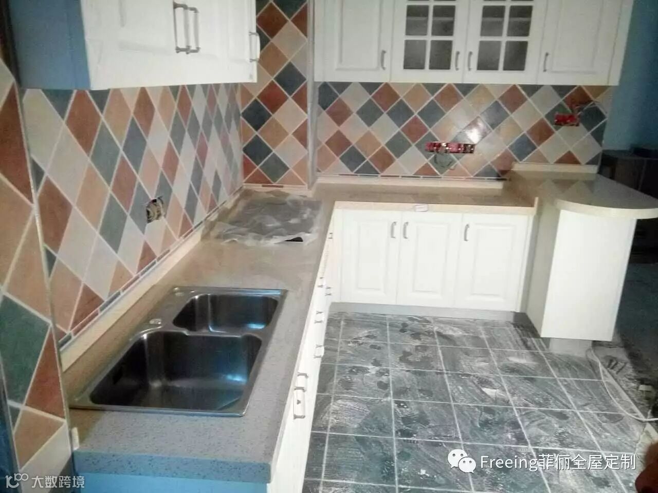 上篇小菲说过:橱柜定制需要多次量尺以确保地柜的高度更加精准。因此,设计方案出来之前,如有必要,菲俪的设计师会多次到客户家进行反复量尺并沟通。第一次到殷老师家,厨房的地砖和墙面已经快完成。