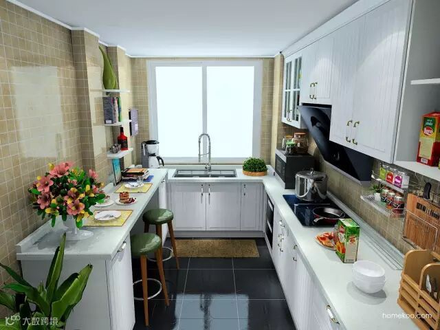 U型厨房打造一排吊柜,与抽油烟机结合成整体。人性化台面设计,橱柜功能变强大。