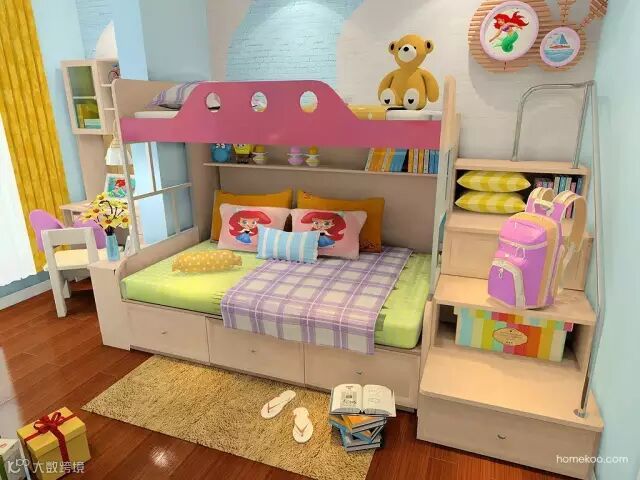 多功能榻榻米床铺外加楼梯储物柜,睡觉玩耍两不误,释放出大片空间。
