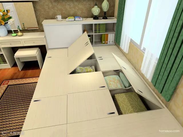 第一个绝妙之处就是笨重的沙发改成实用的榻榻米矮柜设计,收纳和使用两不误,简单省下3㎡。